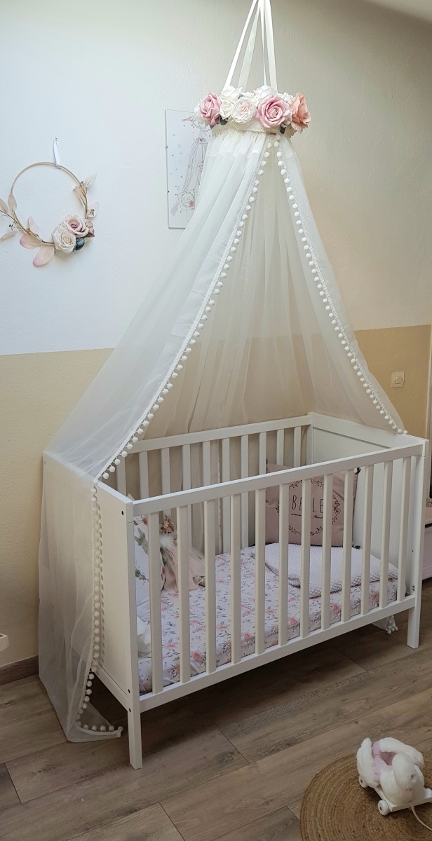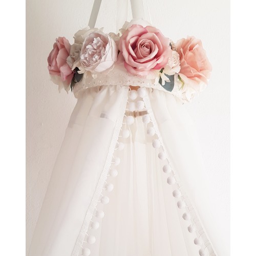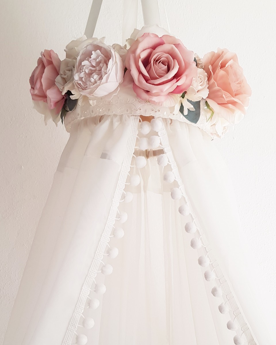 Le ciel de lit modèle Louise est un ciel de lit de princesse composé d'une couronne de fleurs d'excellente qualité d'un diamètre de 45cm/18 pouces, d'un voilage en 2 pans voluptueux d'une longueur de 2m50m/98 pouces, parsemés d'un ruban de pompons pour l'option de base.
