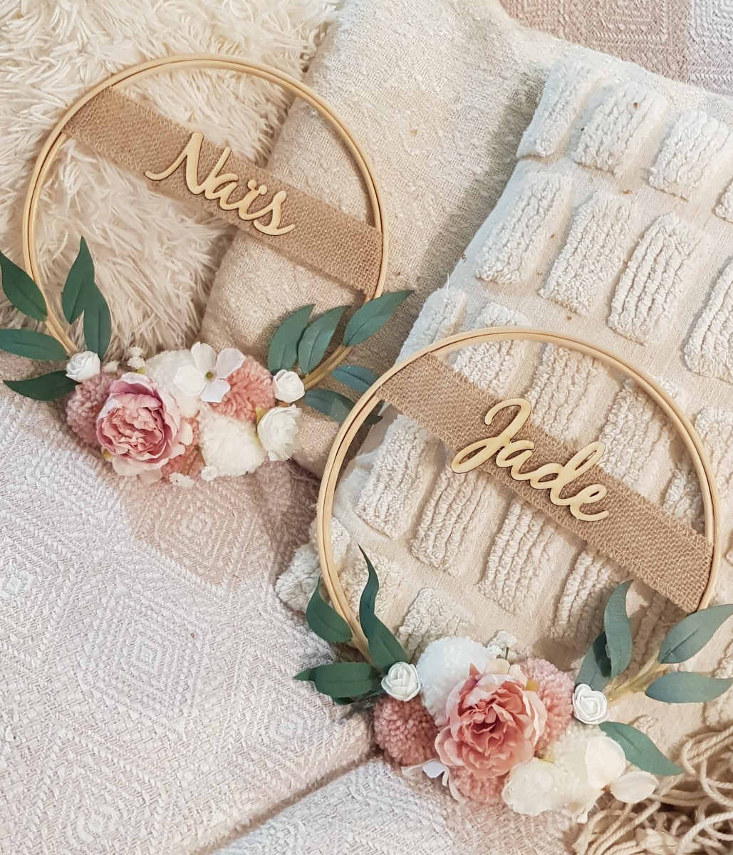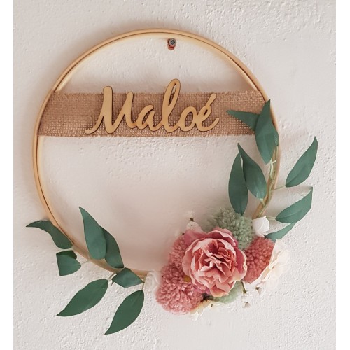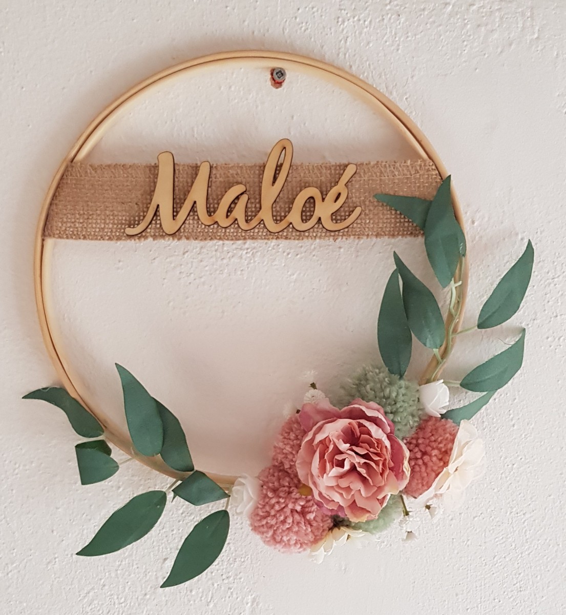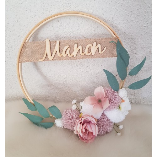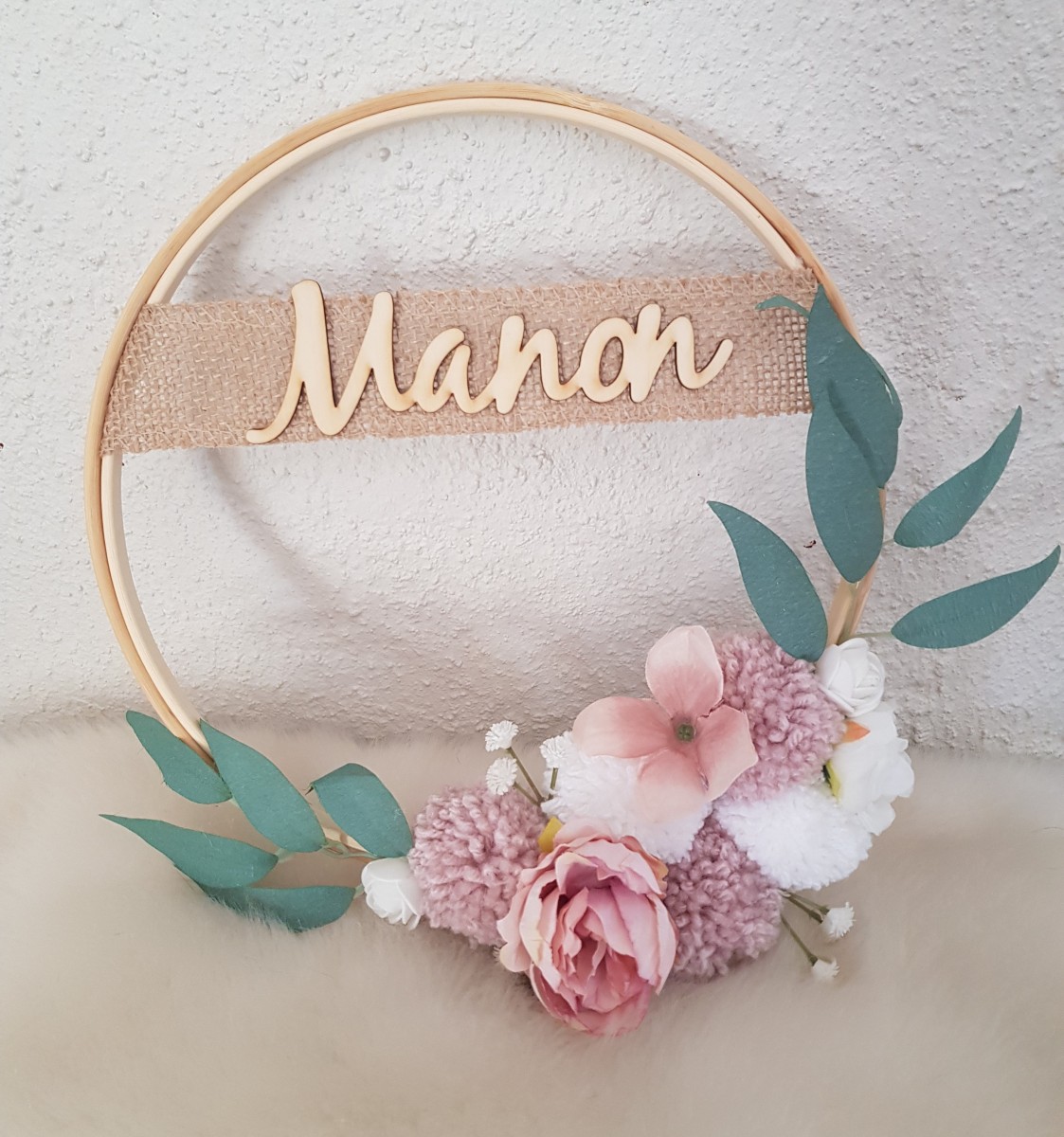 Couronne décorative feuilles de sauge accompagnée de pompons en laine d'une taille de 23cm. Le modèle est personnalisable. Veuillez m'indiquer la couleur des pompons (les blancs sont obligatoires) ansi que le prénom dans les cases prévues à cet effet . Selon la couleur choisie je selectionne les fleurs qui iront parfaitement avec votre couronne! La typographie du prénom peut varier selon la disponibilité et est aléatoire. Le prénom est collé sur un ruban de jute.