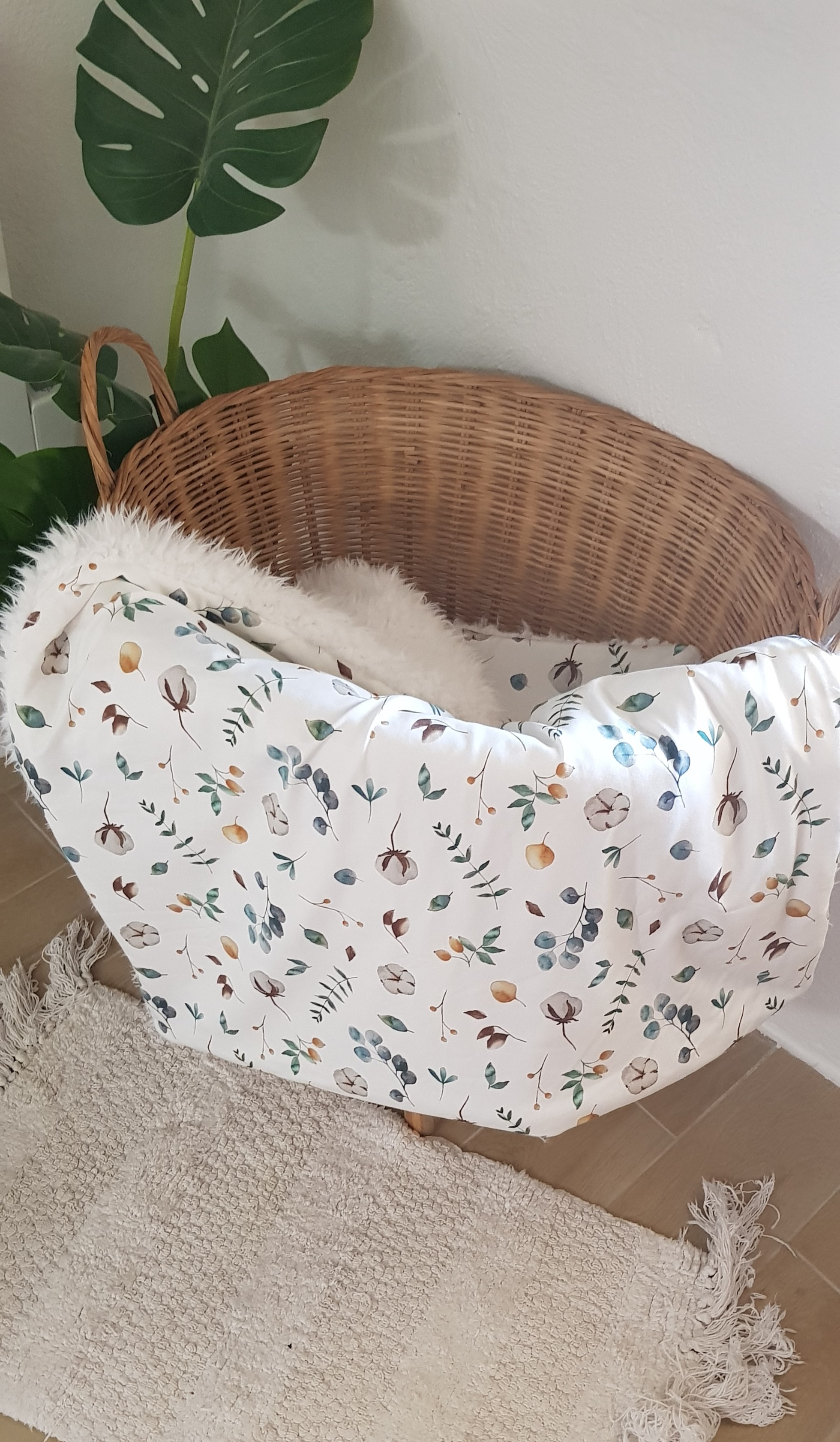 Couverture au motifs d'eucalyptus et de coton, de dimension 70cmx100cm cherche son futur petit proprietaire. Le recto en jersey et verso fausse fourrure lama promettent des nuits douces et pleines de rêves.
