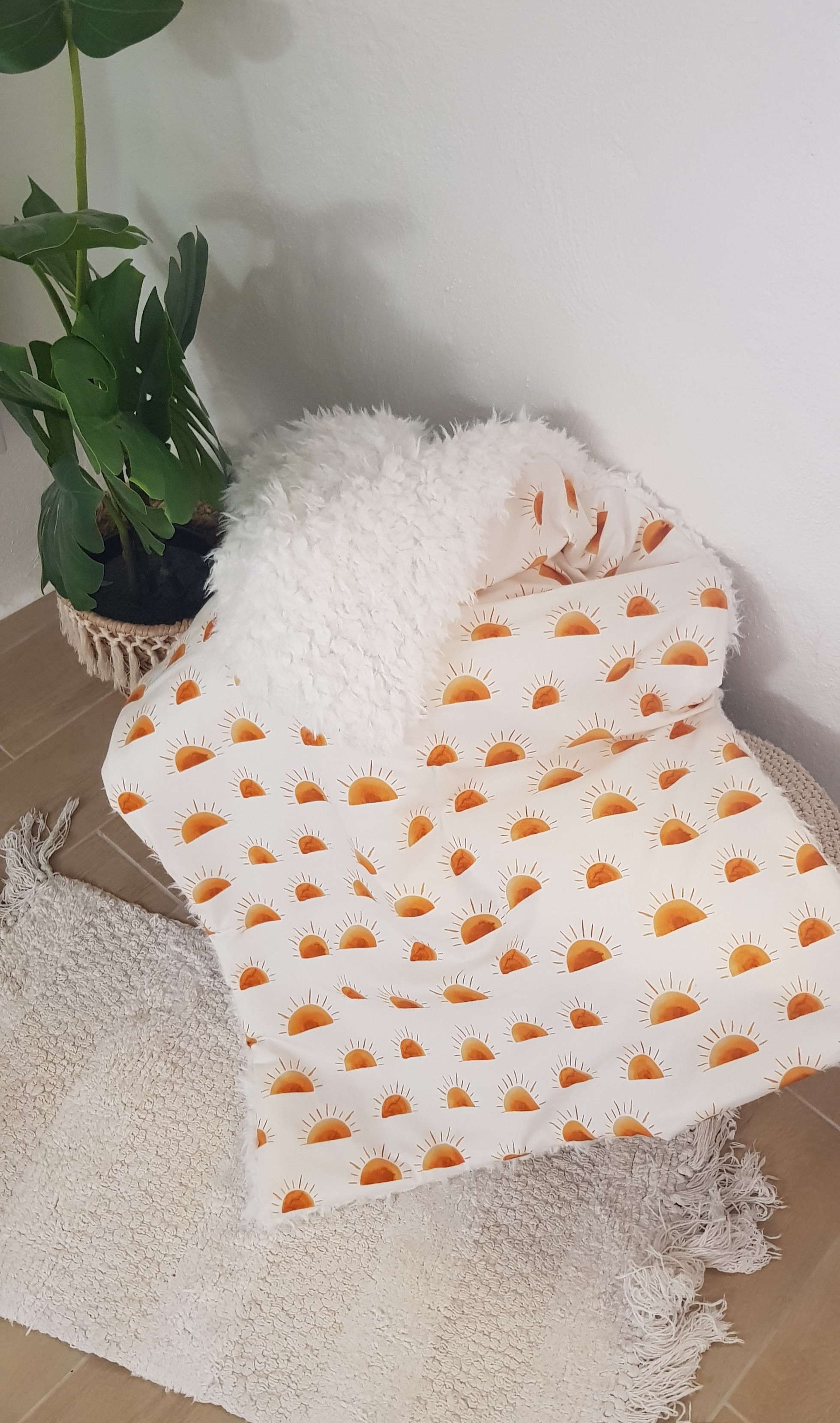 Couverture aux motifs ensoleillés de dimension 70cmx100cm cherche son futur petit proprietaire. Le recto en jersey et verso fausse fourrure lama promettent des nuits douces et pleines de rêves.