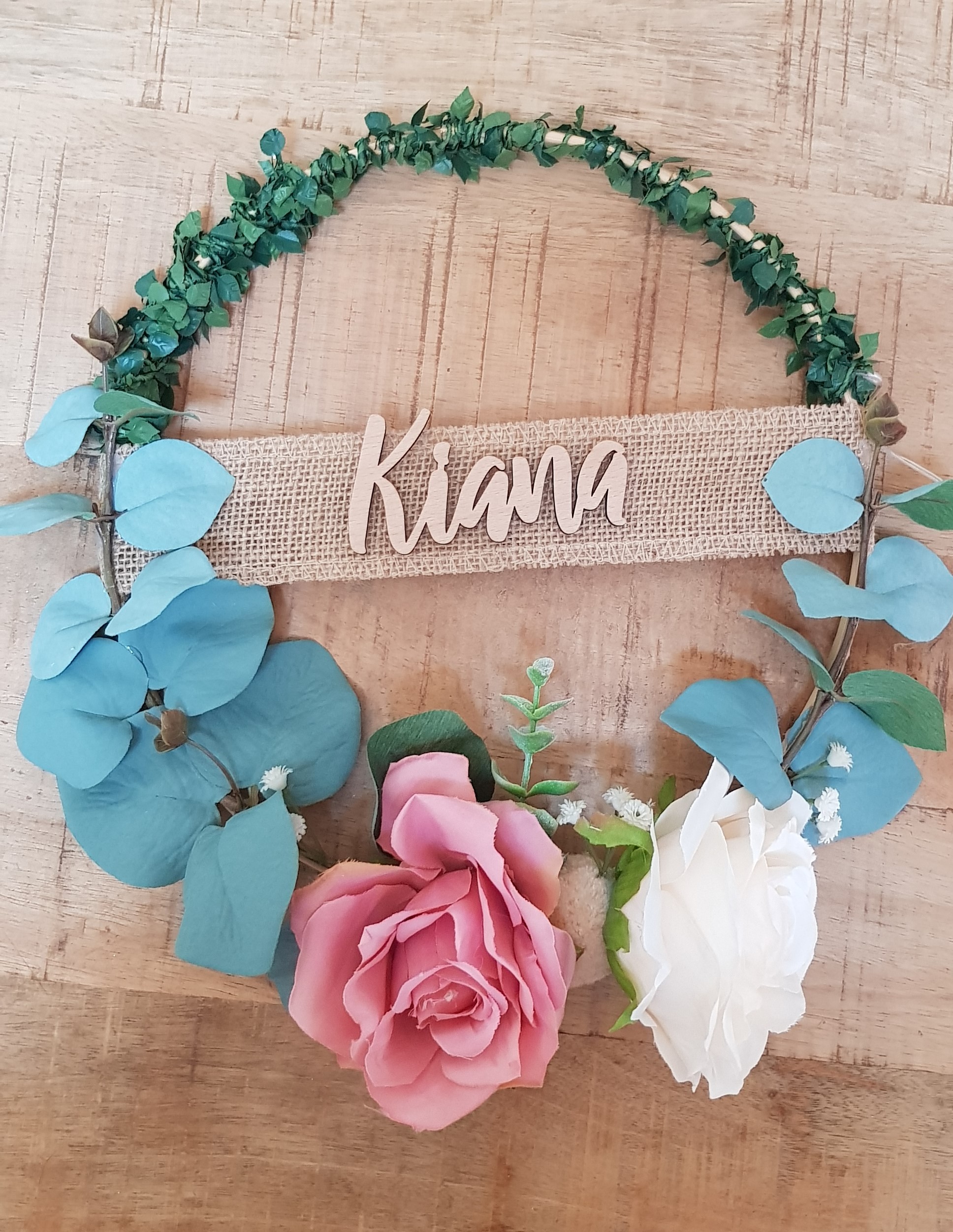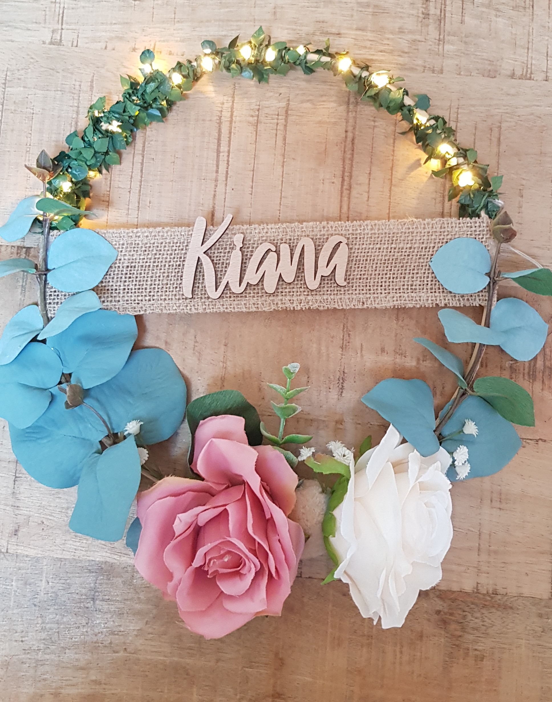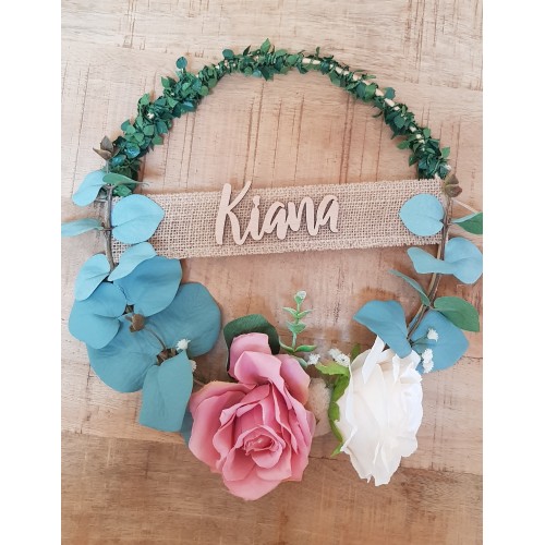 Couronne décorative à base d'eucalyptus bleu accompagnée d'une guirlande de feuille lumineuse et de jolies fleurs rosées. La taille de la couronne est de de 23cm. Le modèle est personnalisable. Veuillez m'indiquer le prénom dans la case prévue à cet effet. La typographie du prénom peut varier selon la disponibilité et est aléatoire. Le prénom est collé sur un ruban de jute.