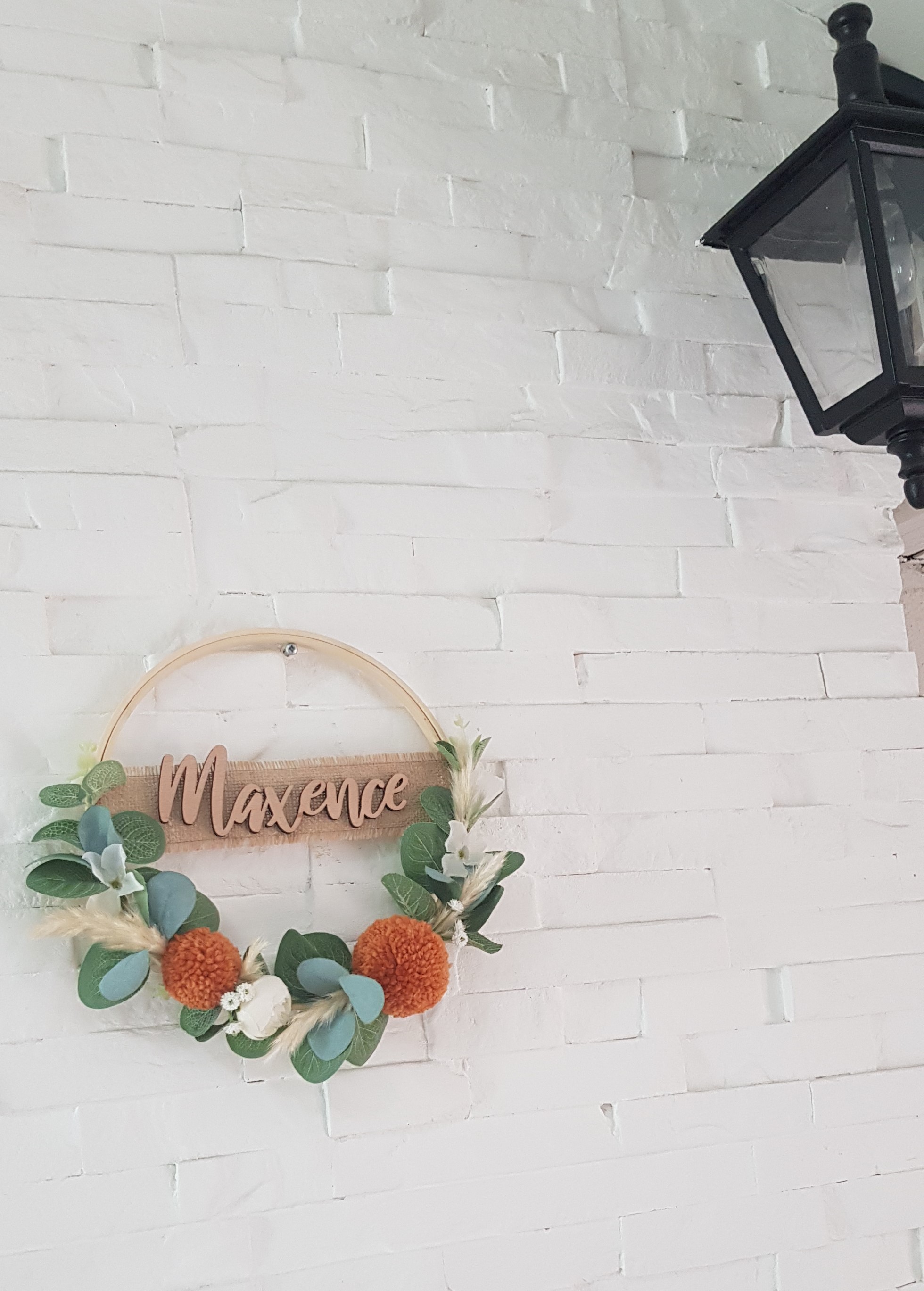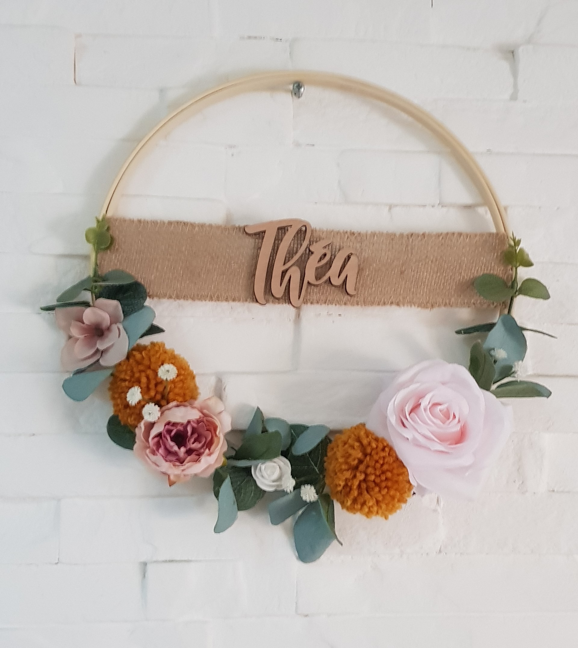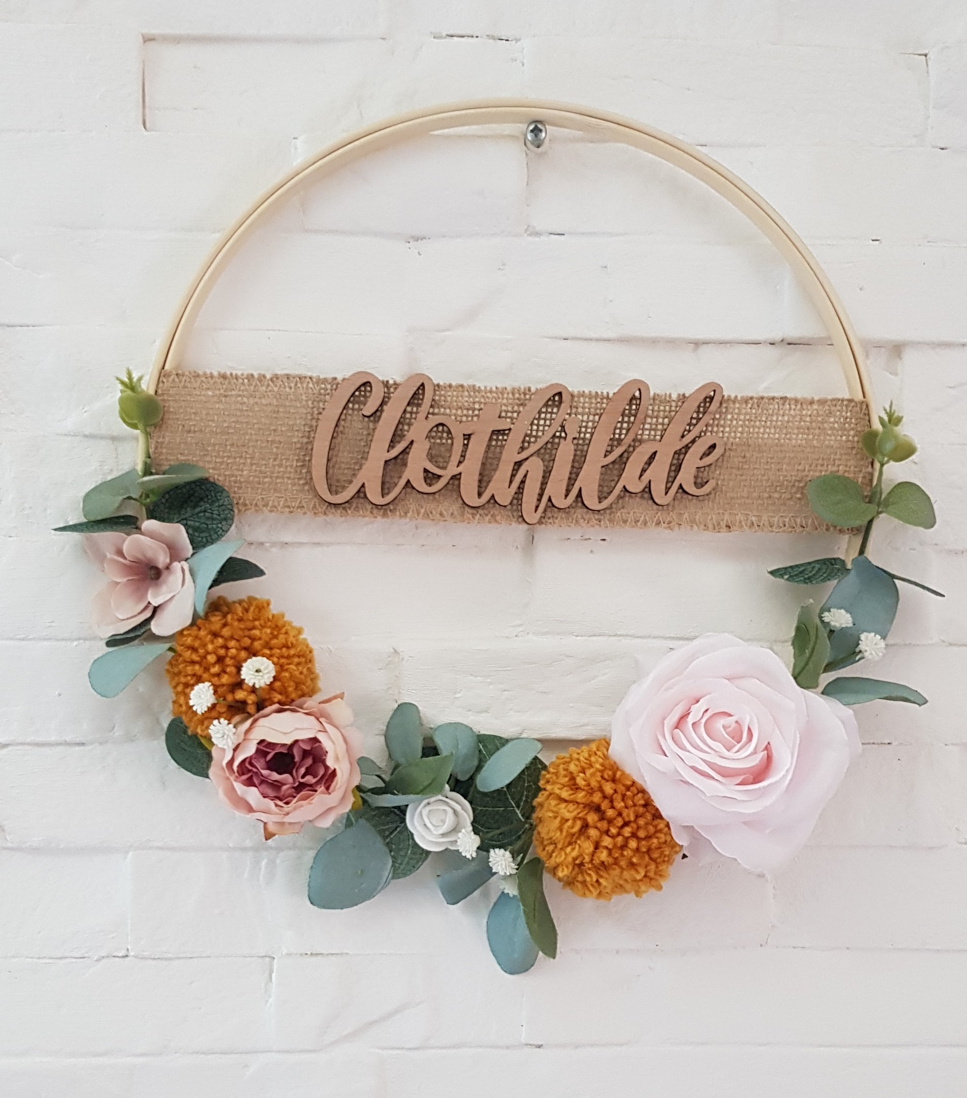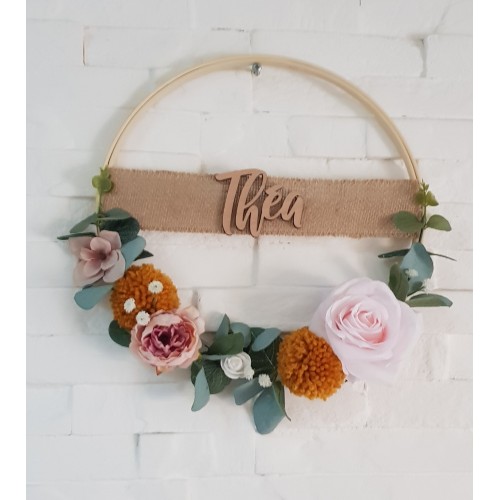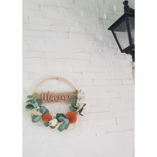 Couronne décorative à base d'eucalyptus et de feuilles accompagnée de pompons en laine de la couleur de votre choix. La taille de la couronne est de de 23cm. Le modèle est personnalisable. Veuillez m'indiquer le prénom dans la case prévue à cet effet. Le prénom est collé sur un ruban de jute.