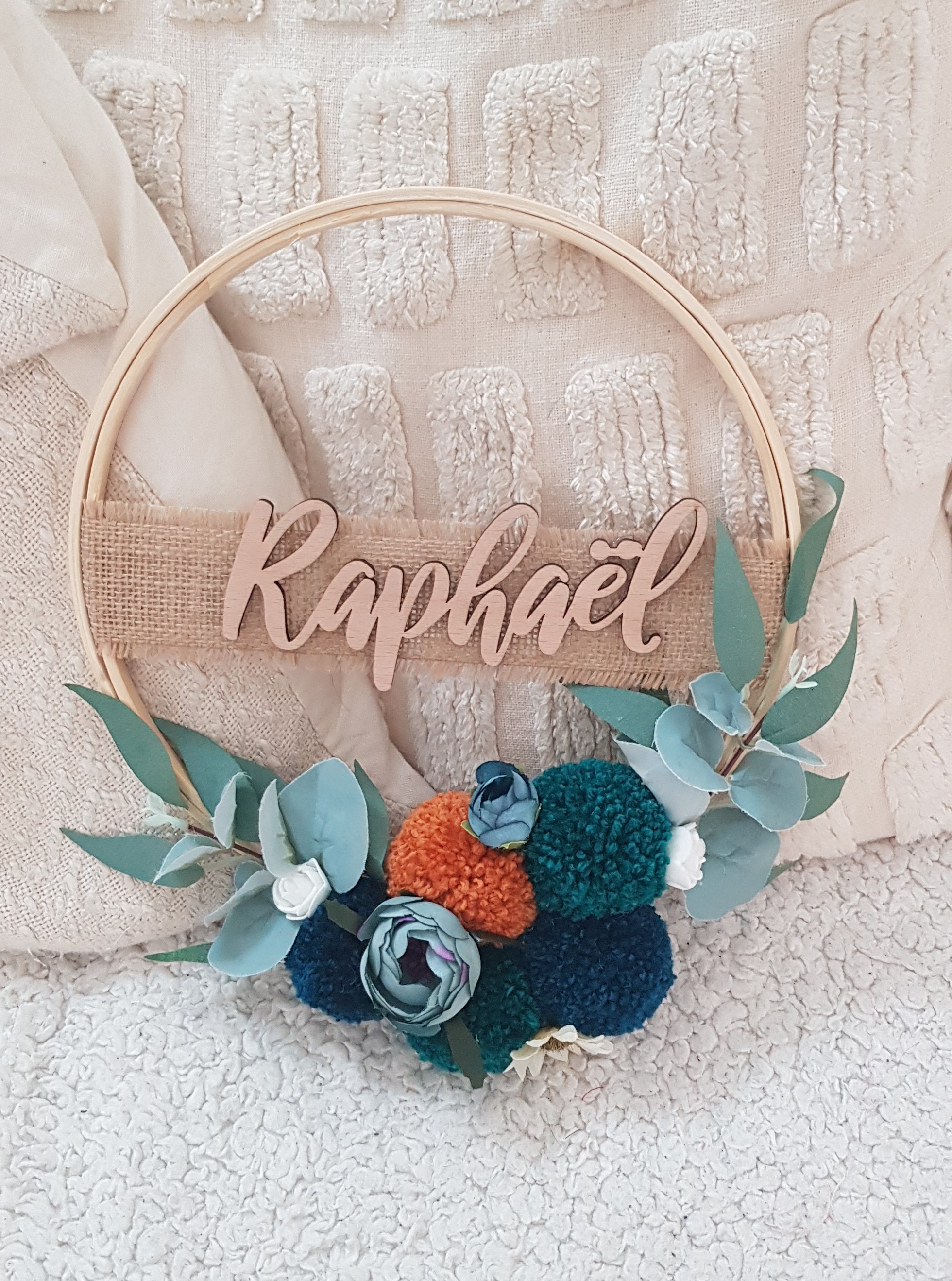 Couronne décorative feuilles de sauge accompagnée de pompons en laine d'une taille de 23cm. Le modèle est personnalisable. Veuillez m'indiquer la couleur des pompons (les blancs sont obligatoires) ansi que le prénom dans les cases prévues à cet effet . Selon la couleur choisie je selectionne les fleurs qui iront parfaitement avec votre couronne! La typographie du prénom peut varier selon la disponibilité et est aléatoire. Le prénom est collé sur un ruban de jute.