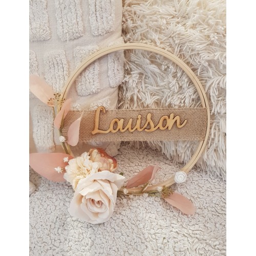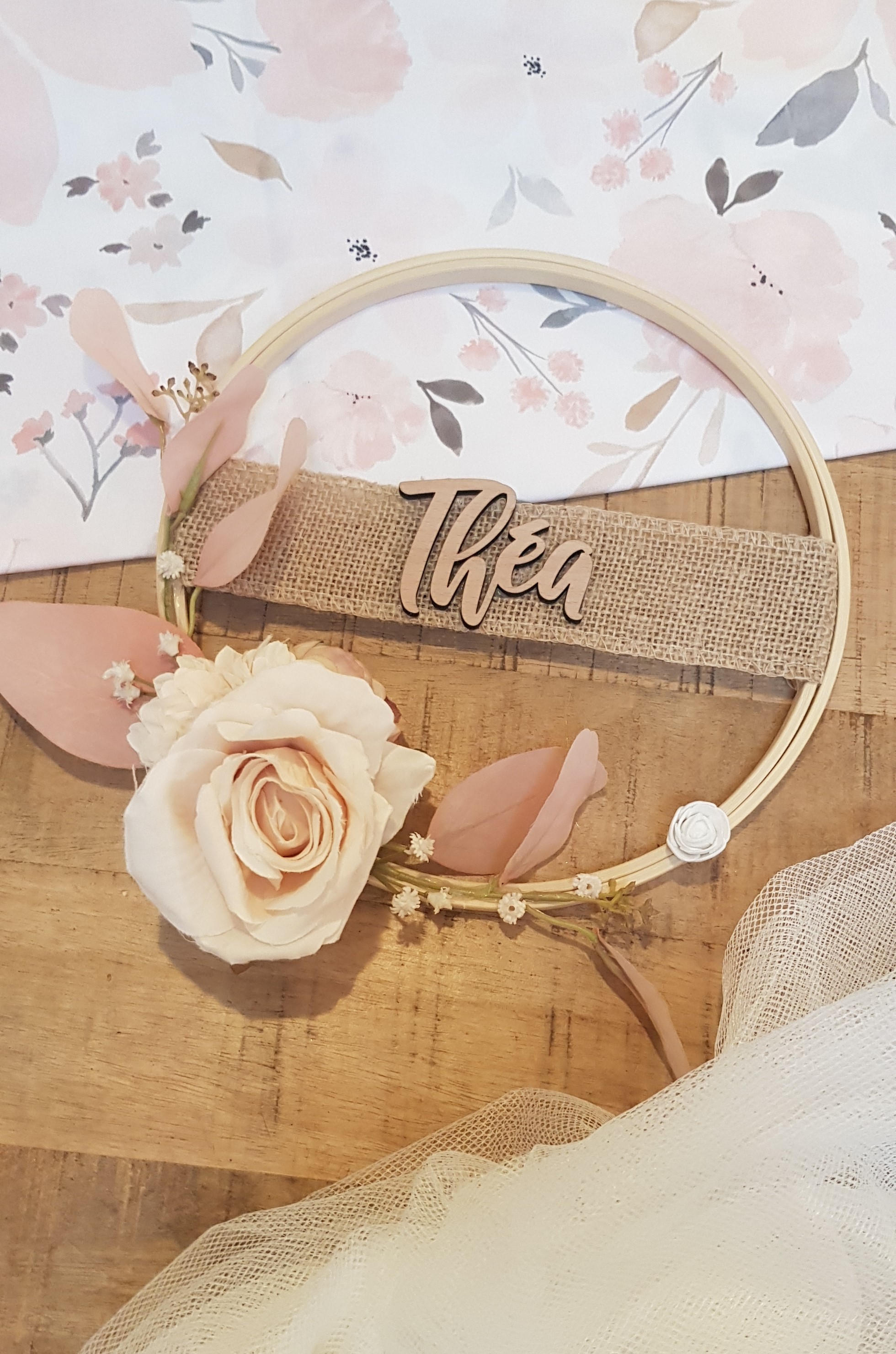 Couronne décorative eucalyptus rose accompagnée d'une rose en soie et de gypsophile d'une taille de 23cm. Le modèle est fixe. Veuillez m'indiquer le prénom dans la case prévue à cet effet. La typographie du prénom peut varier selon la disponibilité et est aléatoire. Le prénom est collé sur un ruban de jute.