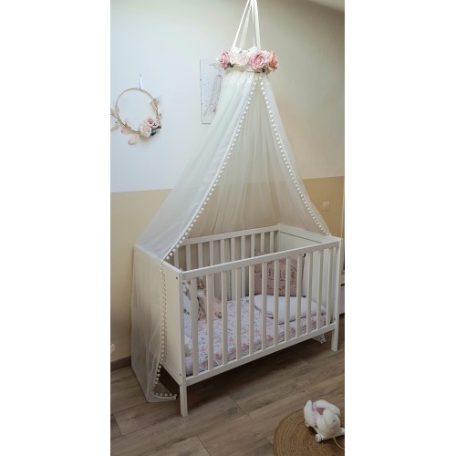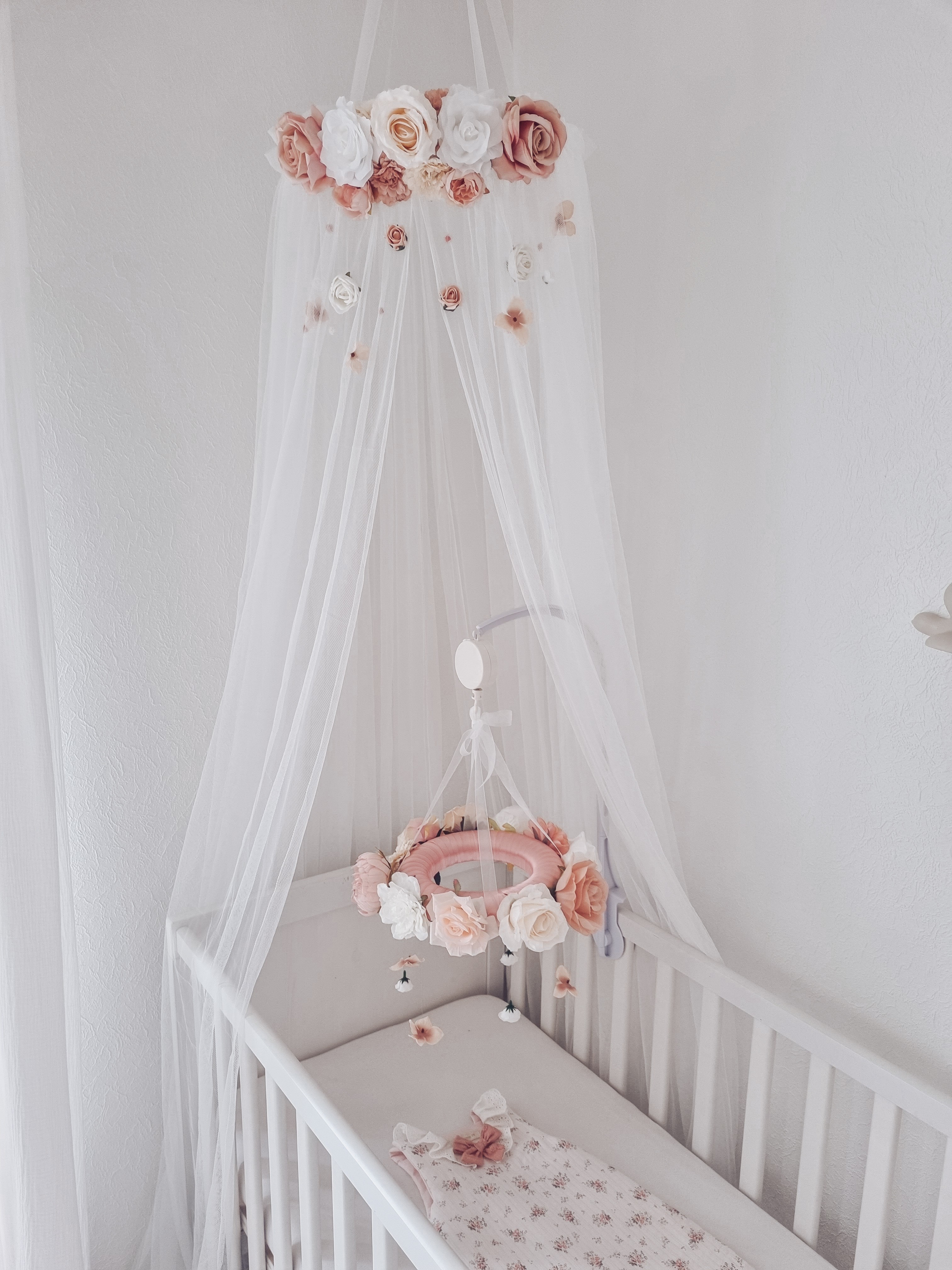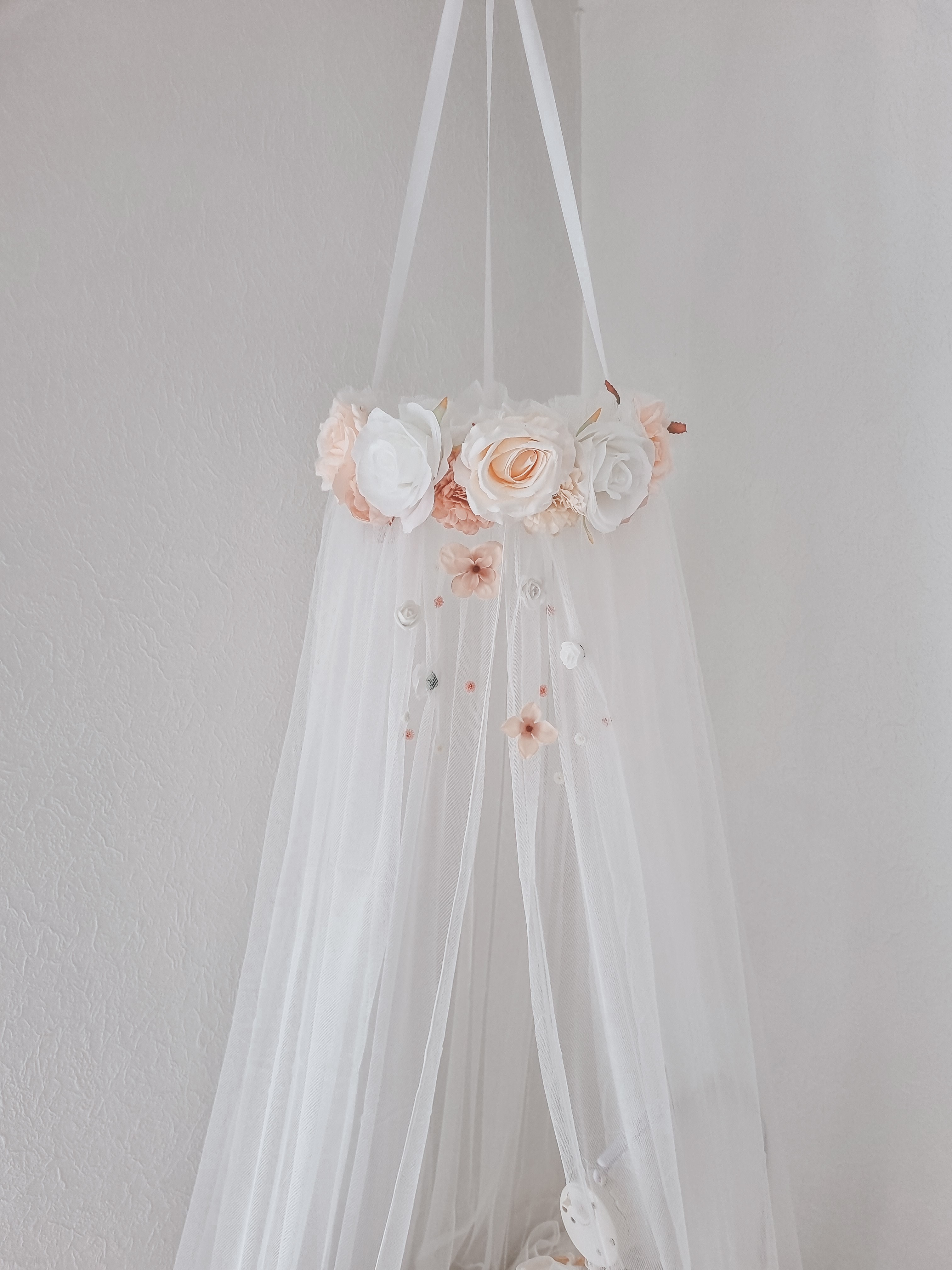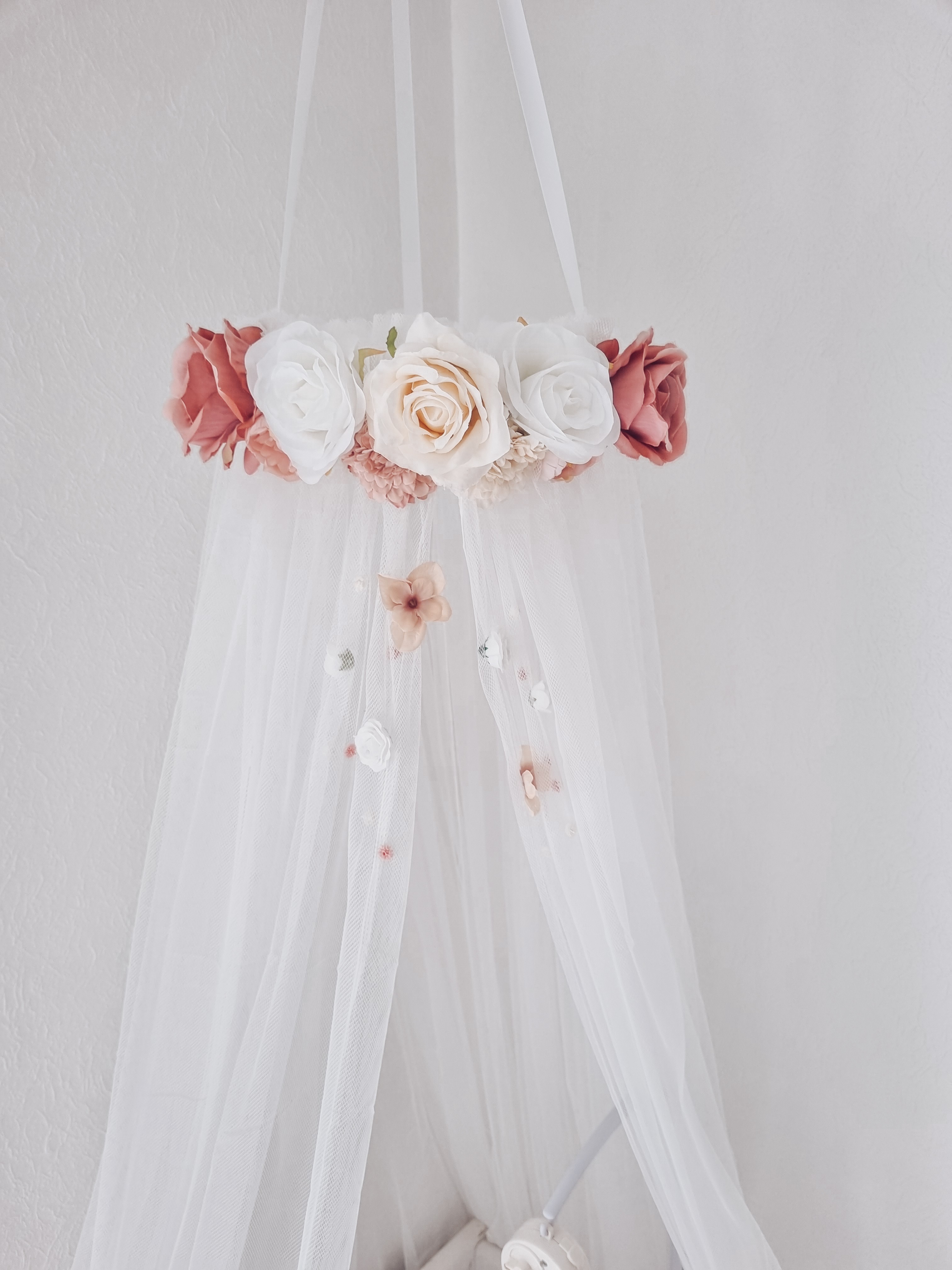 Le ciel de lit modèle Constance est composé d'une composition de fleurs d'excellentes qualitées, sur un cercle d'un diamètre de 26cm/10 pouces, d'un voilage en 2 pans voluptueux d'une longueur de 2m50/98 pouces parsemés de petites fleurs.